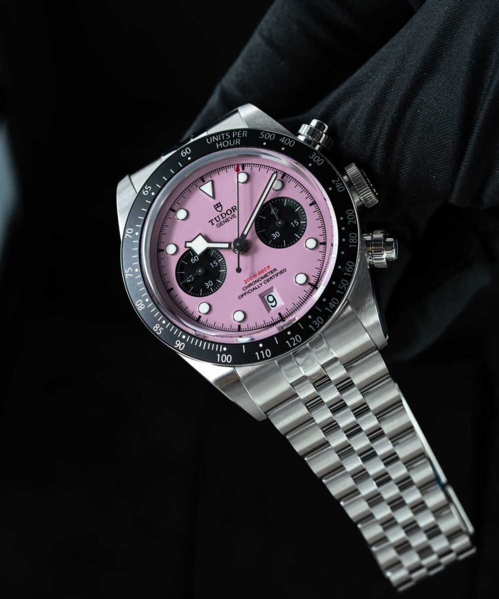 This Tudor Black Bay Chronograph 79360N has a Pink dial and a Bracelet strap.