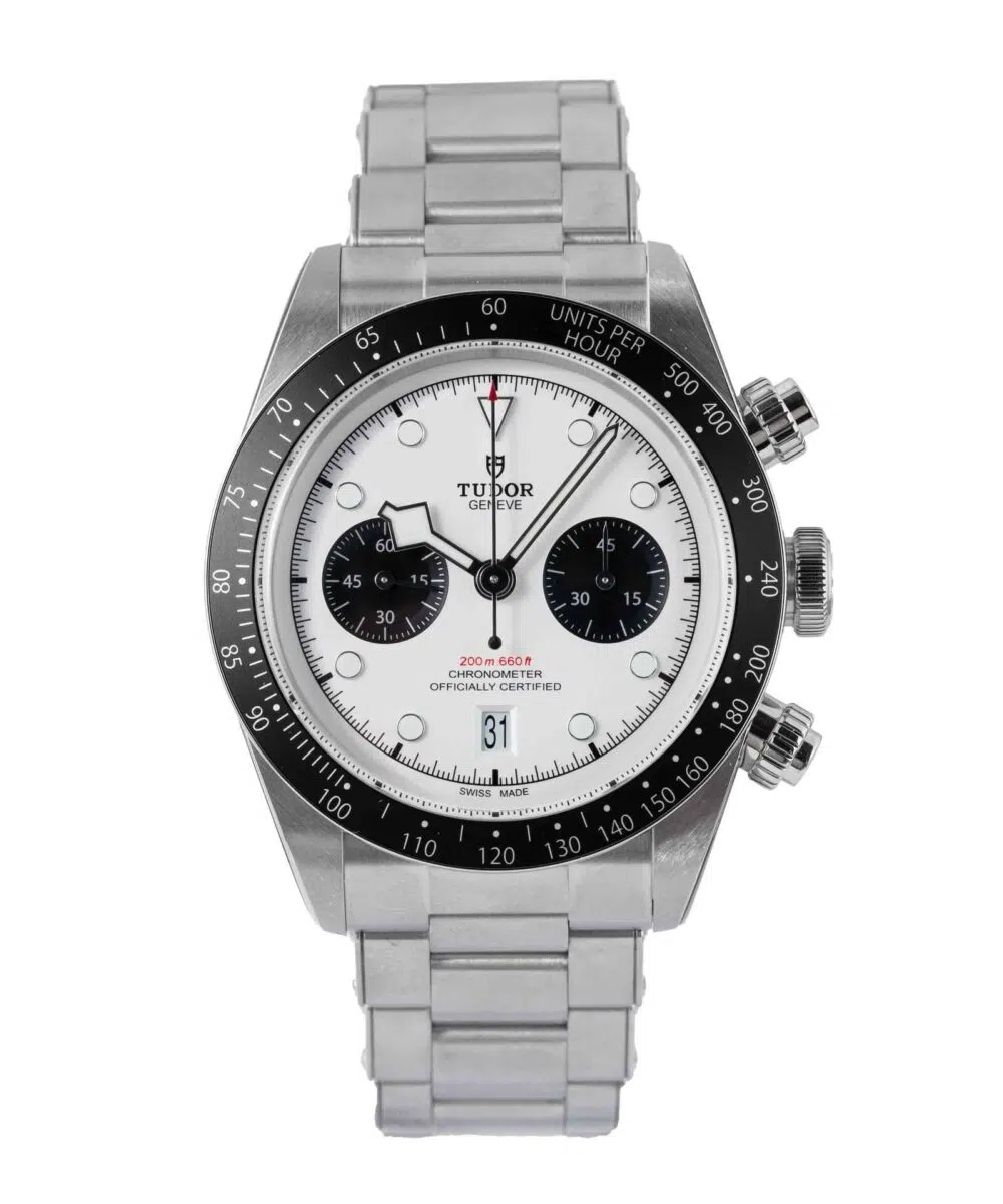 This Tudor Black Bay Chronograph 79360N has a White dial and a Bracelet strap.