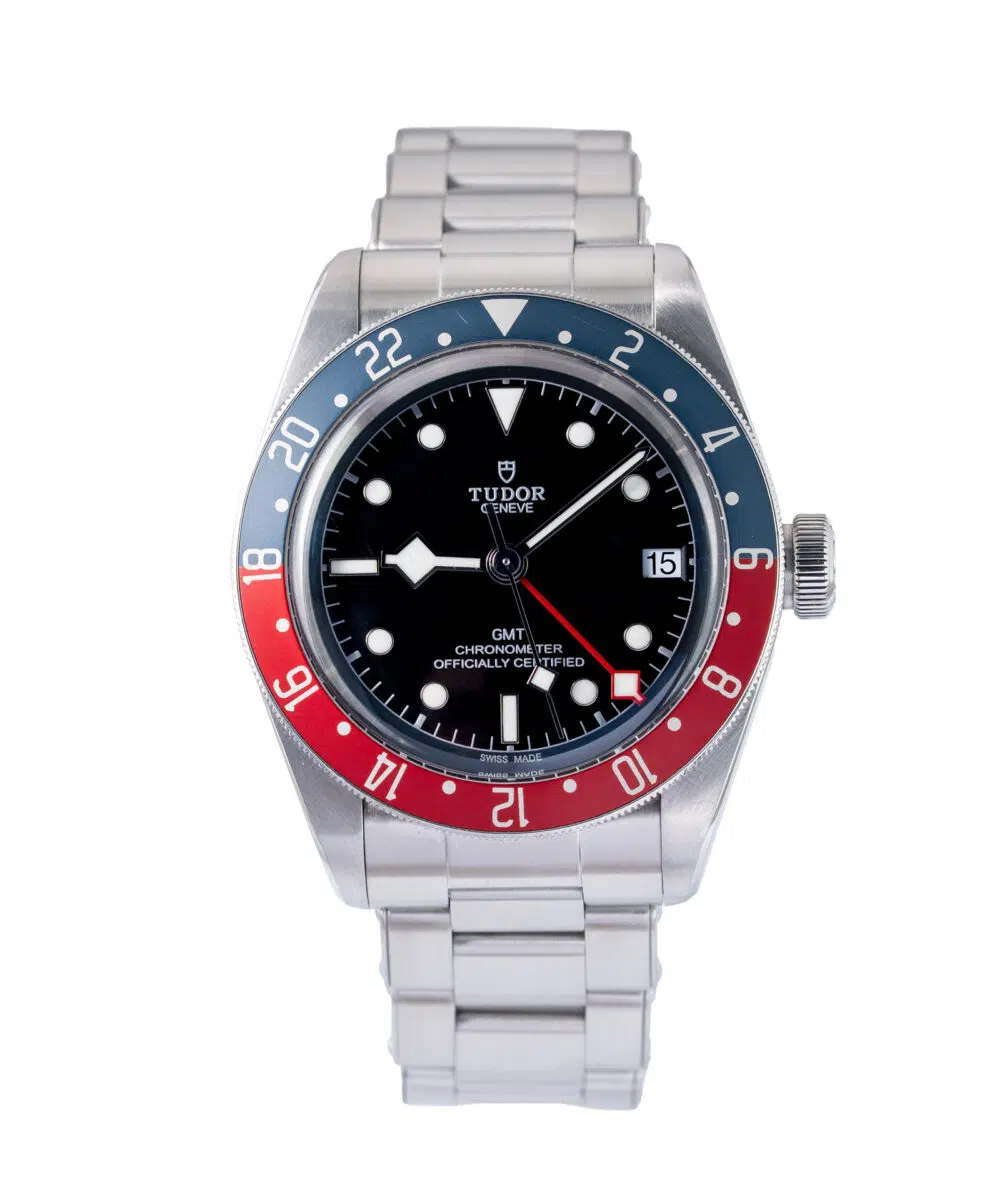 This Tudor Black Bay GMT 79830RB has a Black dial and a Bracelet strap.