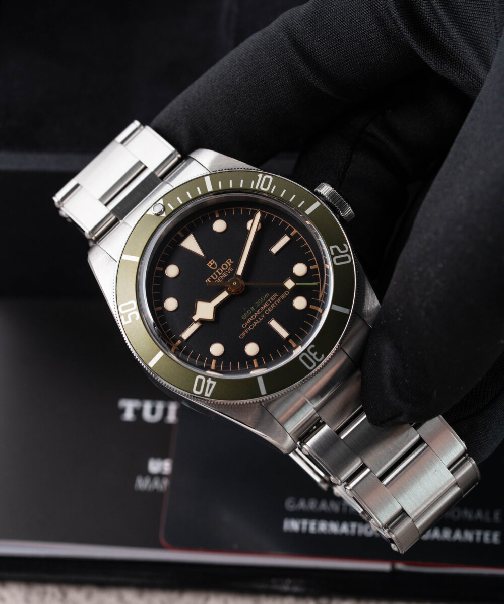 This Tudor Black Bay Harrods Edition 79230G has a Black dial and a Bracelet strap.
