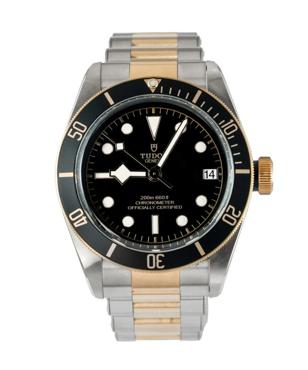This Tudor Black Bay S&g 79733N has a Black dial and a Bracelet strap.