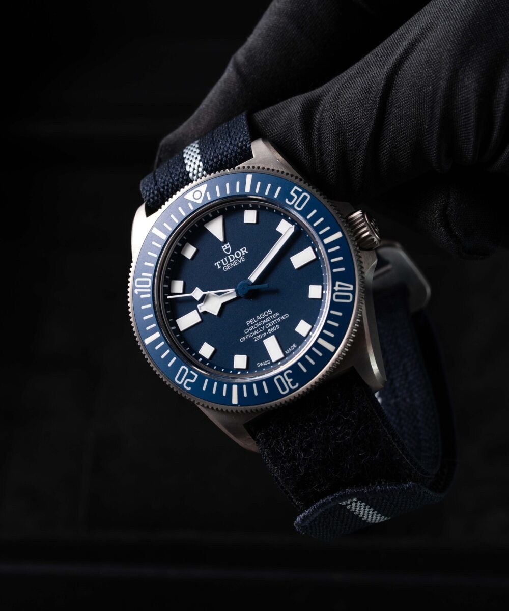 This Tudor Fxd Pelagos 25707B/24 has a Blue dial and a Fabric strap.