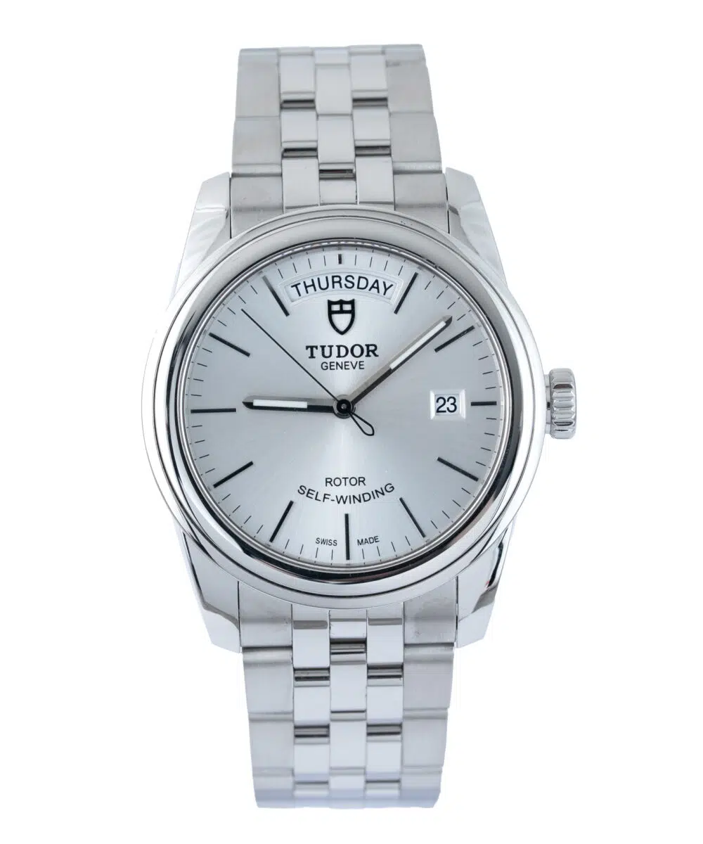This Tudor Glamour Date-Day 56000 has a Silver dial and a Bracelet strap.
