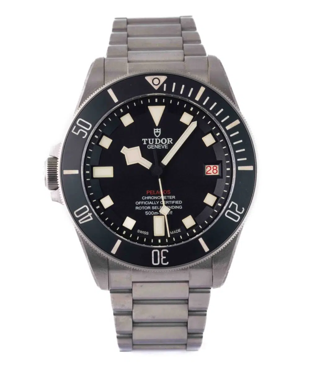 This Tudor Pelagos 25610TNL has a Black dial and a Bracelet strap.