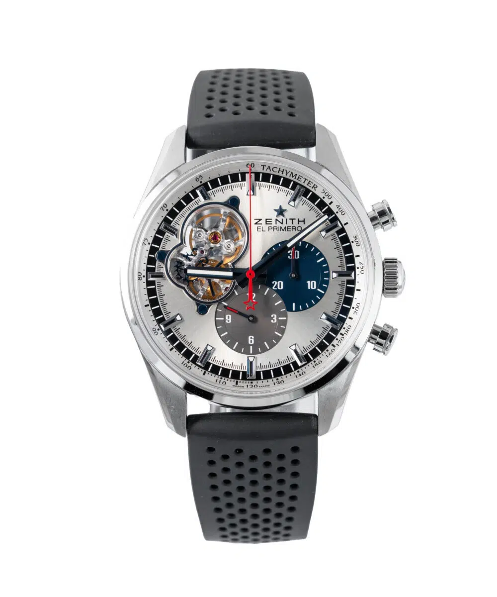 This ZENITH Chronomaster El Primero 03.2040.4061/69.R576 has a Silver dial and a Rubber strap.