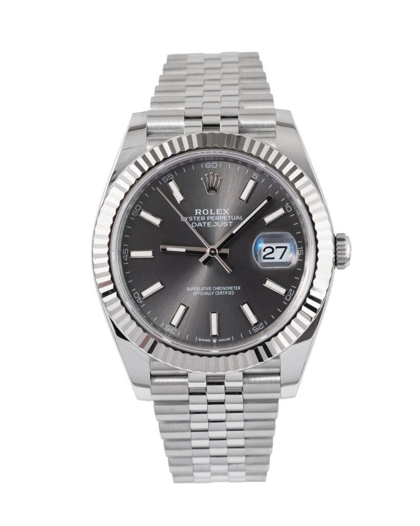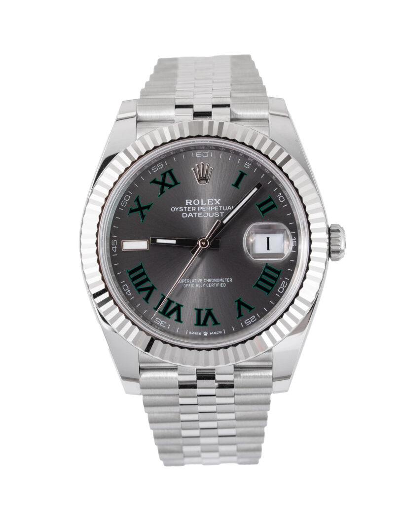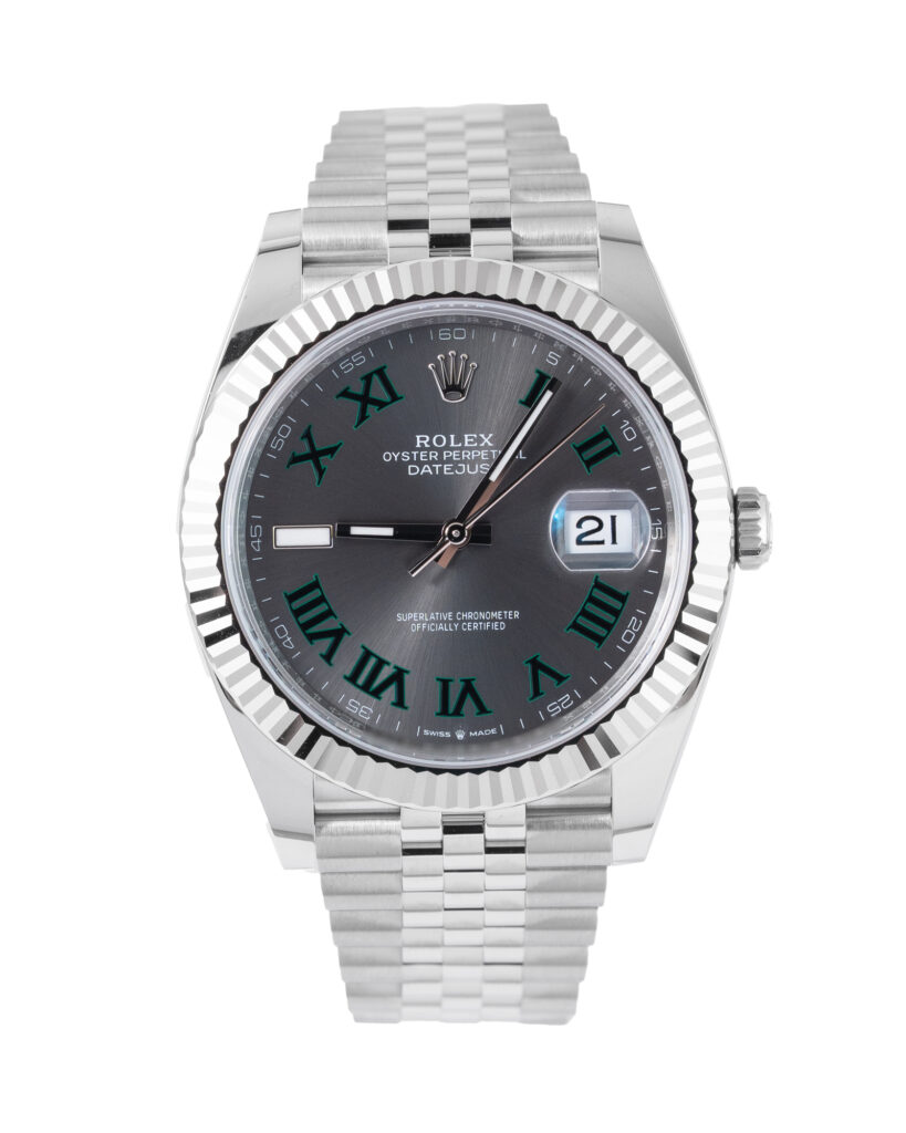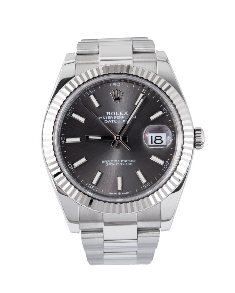 brand: Rolex Reference: 126334 Model: Datejust case MATERIAL: Steel strap: Bracelet case Size (MM): 41mm Dial colour: Grey Bezel: White Gold Condition: Excellent Box papers : Paperwork/box