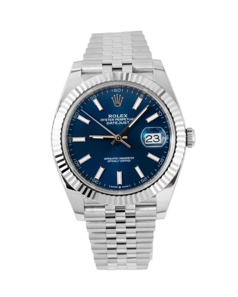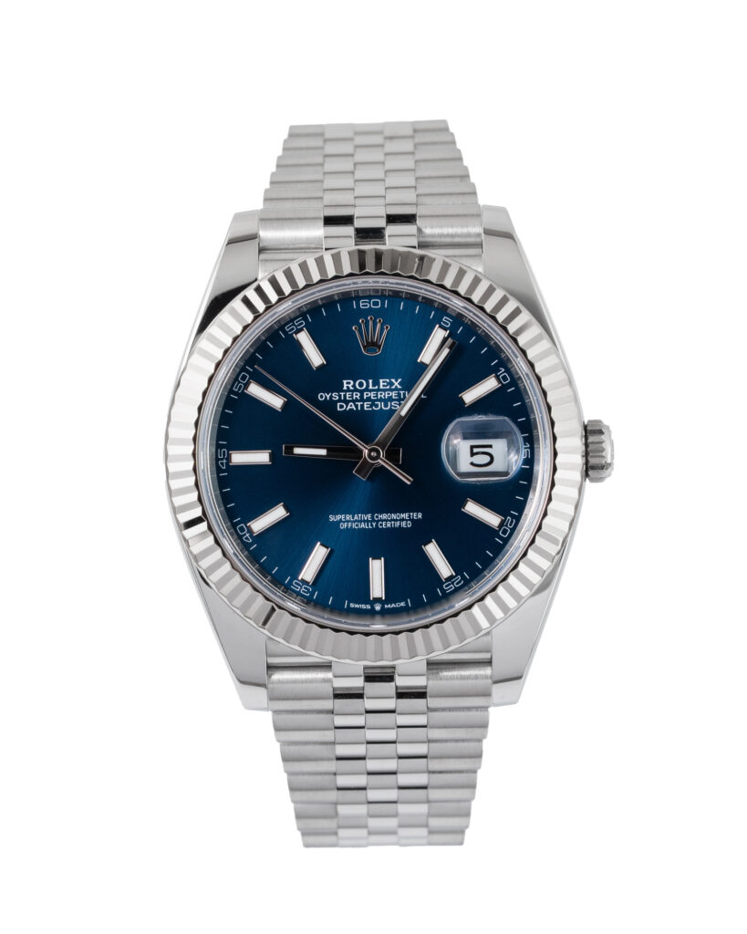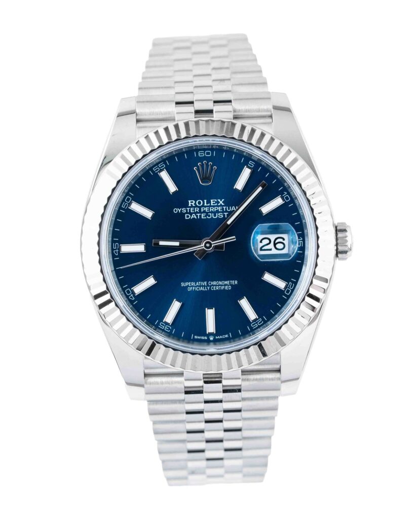 brand: Rolex Reference: 126334 Model: Datejust case MATERIAL: Steel strap: Bracelet case Size (MM): 41mm Dial colour: Blue Bezel: White Gold Year: 12/2024 Condition: Excellent Box papers : Paperwork/box