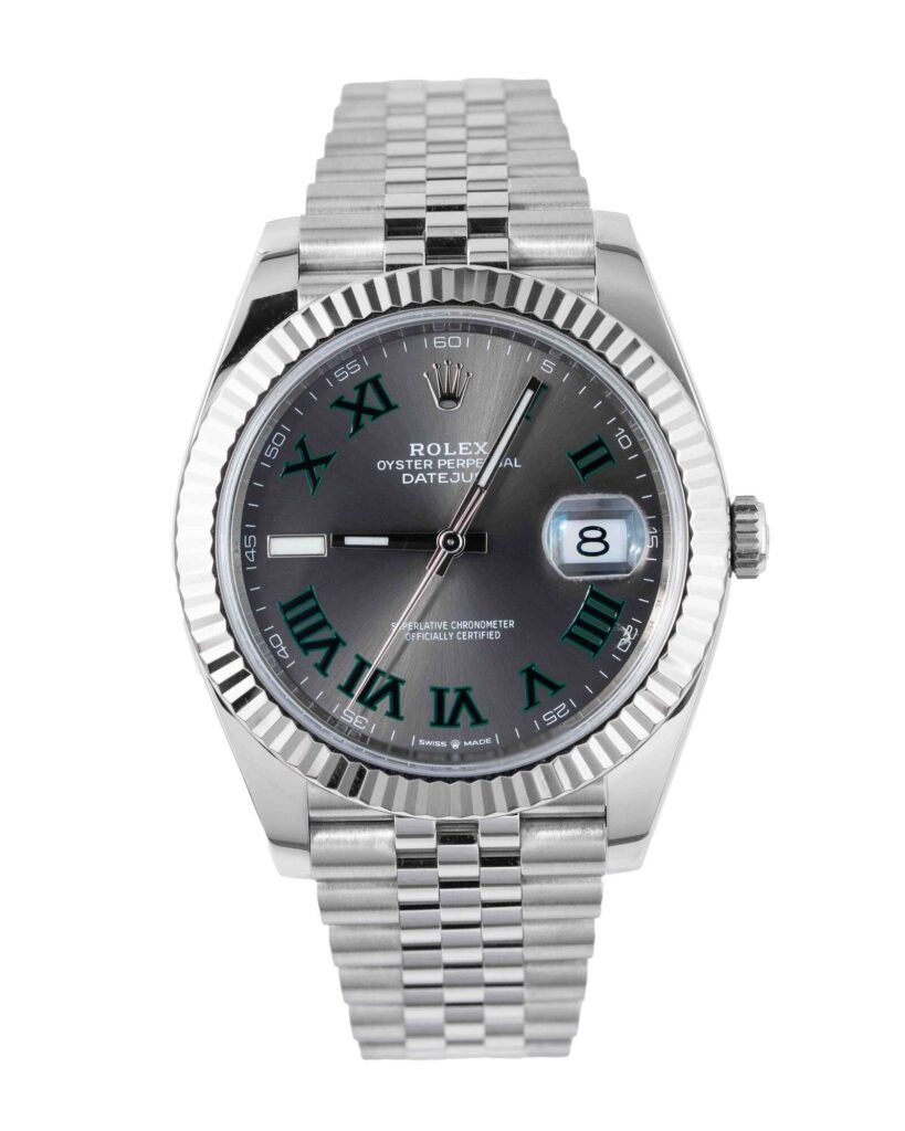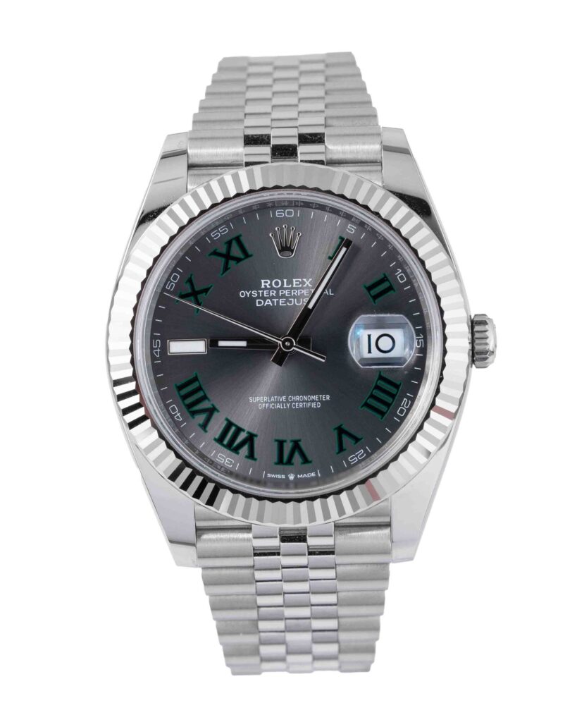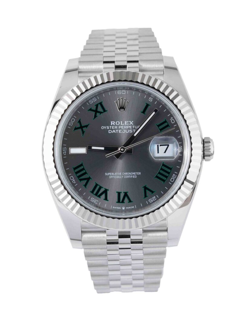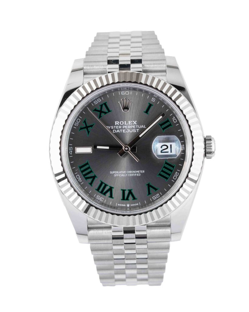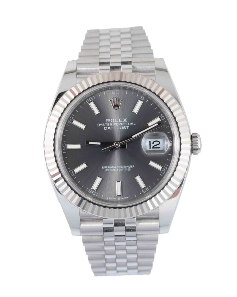 brand: Rolex Reference: 126334 Model: Datejust case MATERIAL: Steel strap: Bracelet case Size (MM): 41mm Dial colour: Grey Bezel: White Gold Condition: Excellent Box papers : Paperwork/box