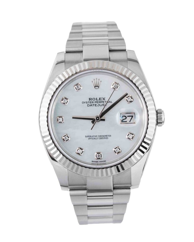 brand: Rolex Reference: 126334 Model: Datejust case MATERIAL: Steel strap: Bracelet case Size (MM): 41mm Dial colour: Mother Of Pearl Bezel: White Gold Year: 04/2021 Condition: Excellent Box papers : Paperwork/box
