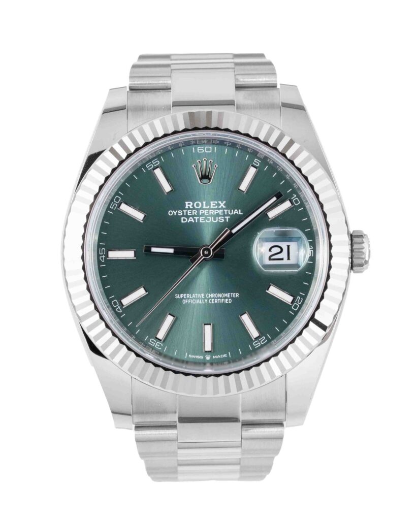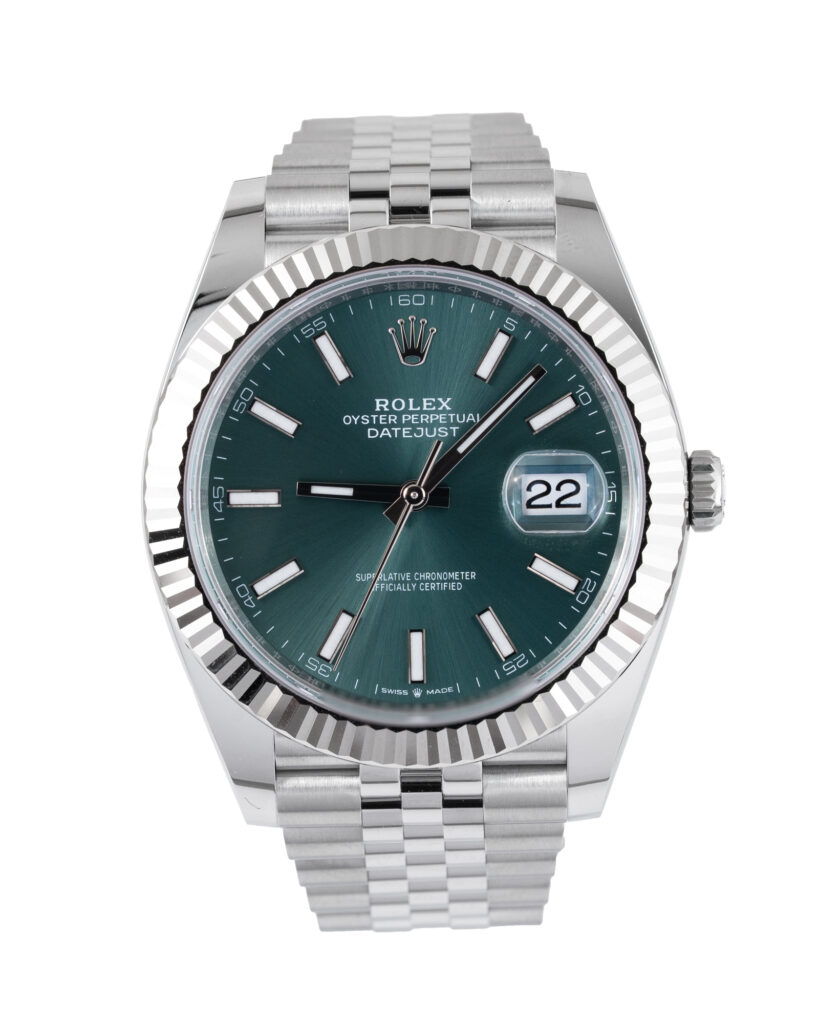 brand: Rolex Reference: 126334 Model: Datejust case MATERIAL: Steel strap: Bracelet case Size (MM): 41mm Dial colour: Green Bezel: White Gold Year: 07/2025 Condition: Unworn Box papers : Paperwork/box