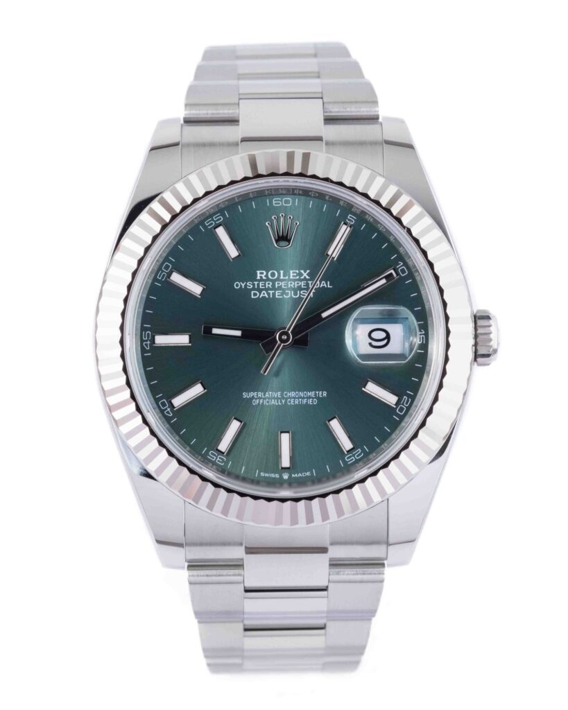 brand: Rolex Reference: 126334 Model: Datejust case MATERIAL: White Gold strap: Bracelet case Size (MM): 41mm Dial colour: Green Bezel: Steel Year: 02/2025 Condition: Unworn Box papers : Paperwork/box