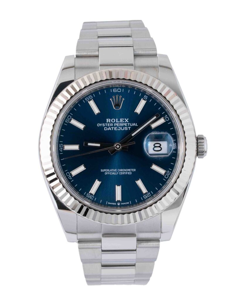brand: Rolex Reference: 126334 Model: Datejust case MATERIAL: Steel strap: Bracelet case Size (MM): 41mm Dial colour: Blue Bezel: White Gold Year: 08/2021 Condition: Excellent Box papers : Paperwork/box