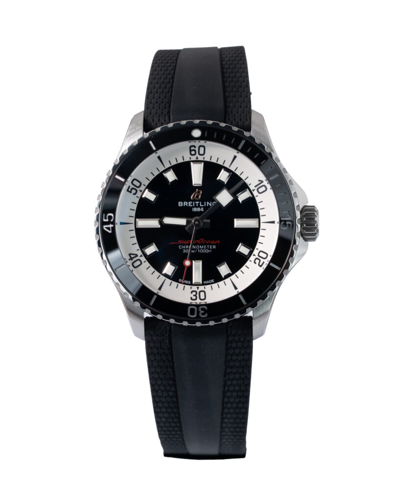 brand: Breitling Reference: A17375 Model: Superocean 42 case MATERIAL: Steel strap: Rubber case Size (MM): 42mm Dial colour: Black Bezel: Ceramic Year: 12/2022 Condition: Excellent Box papers : Paperwork/box