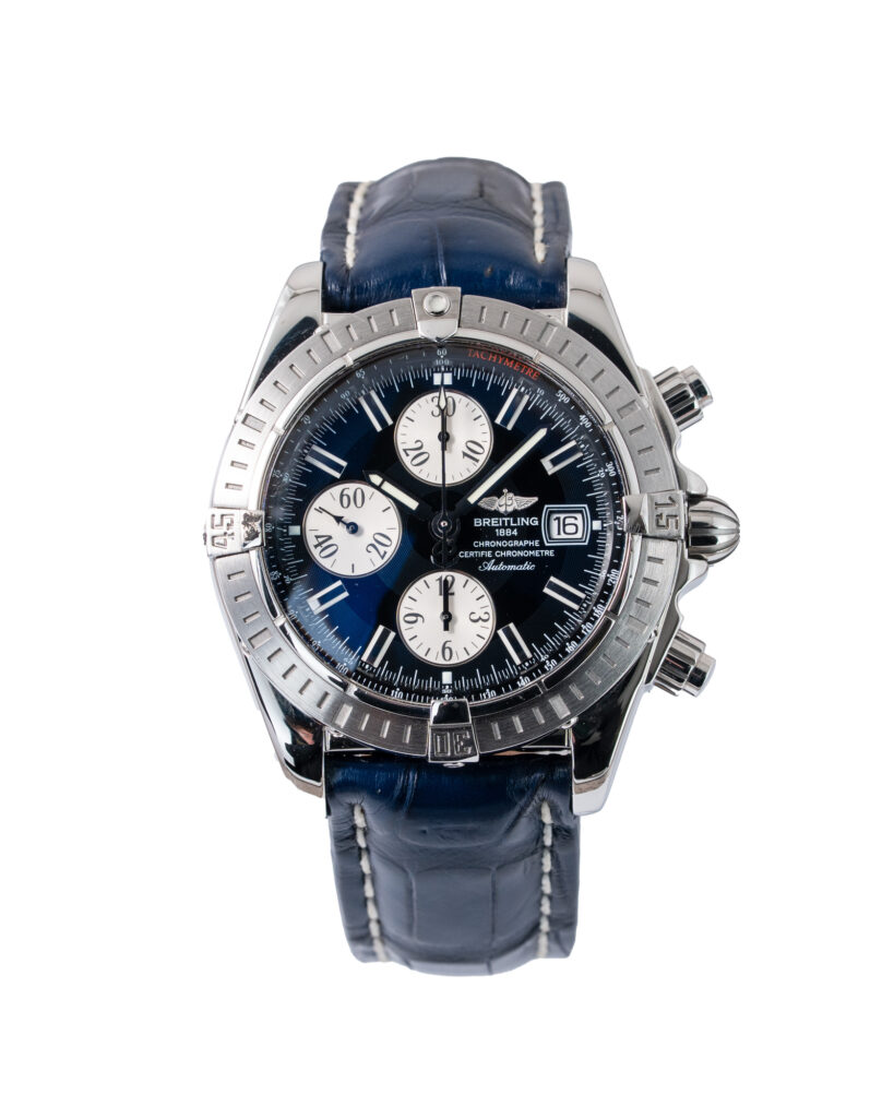brand: Breitling Reference: A13356 Model: Chronomat Evolution case MATERIAL: Steel strap: Leather case Size (MM): 43mm Dial colour: Black Bezel: Steel Year: 03/2011 Condition: Excellent Box papers : Paperwork/box
