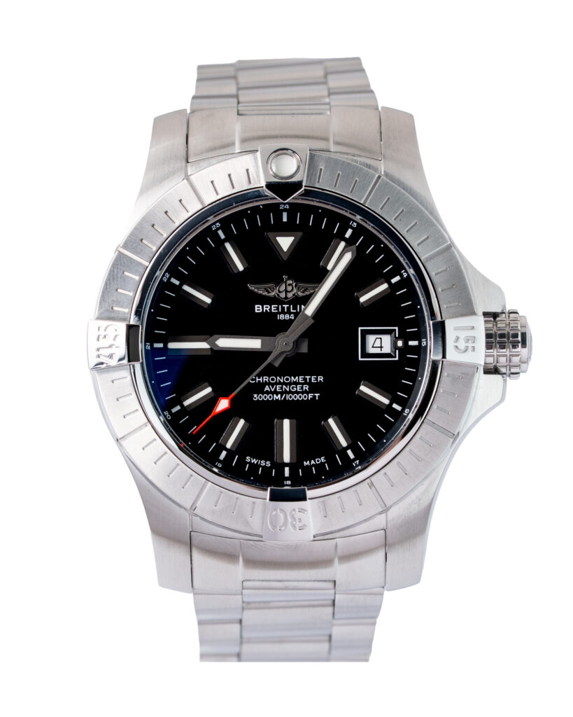 brand: Breitling Reference: A17319 Model: Avenger Seawolf 45 case MATERIAL: Steel strap: Bracelet case Size (MM): 45mm Dial colour: Black Bezel: Steel Year: 04/2024 Condition: Excellent Box papers : Paperwork/box