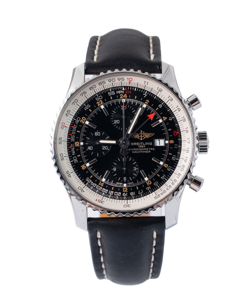 brand: Breitling Reference: A2432212/B726 Model: Navitimer World case MATERIAL: Steel strap: Leather case Size (MM): 46mm Dial colour: Black Bezel: Steel Year: 03/2017 Condition: Excellent Box papers : Paperwork/box