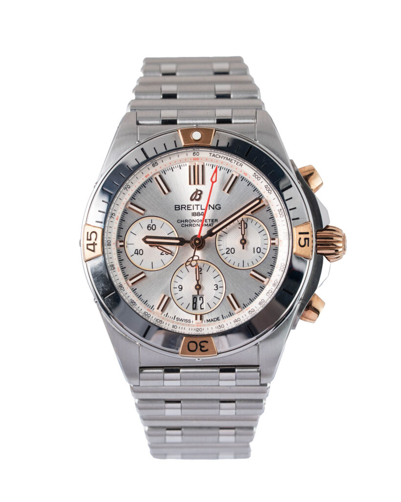 brand: Breitling Reference: AB0134 Model: Chronomat 42 case MATERIAL: Steel & Rose Gold strap: Bracelet case Size (MM): 42mm Dial colour: Silver Bezel: Steel Condition: Excellent Box papers : Box