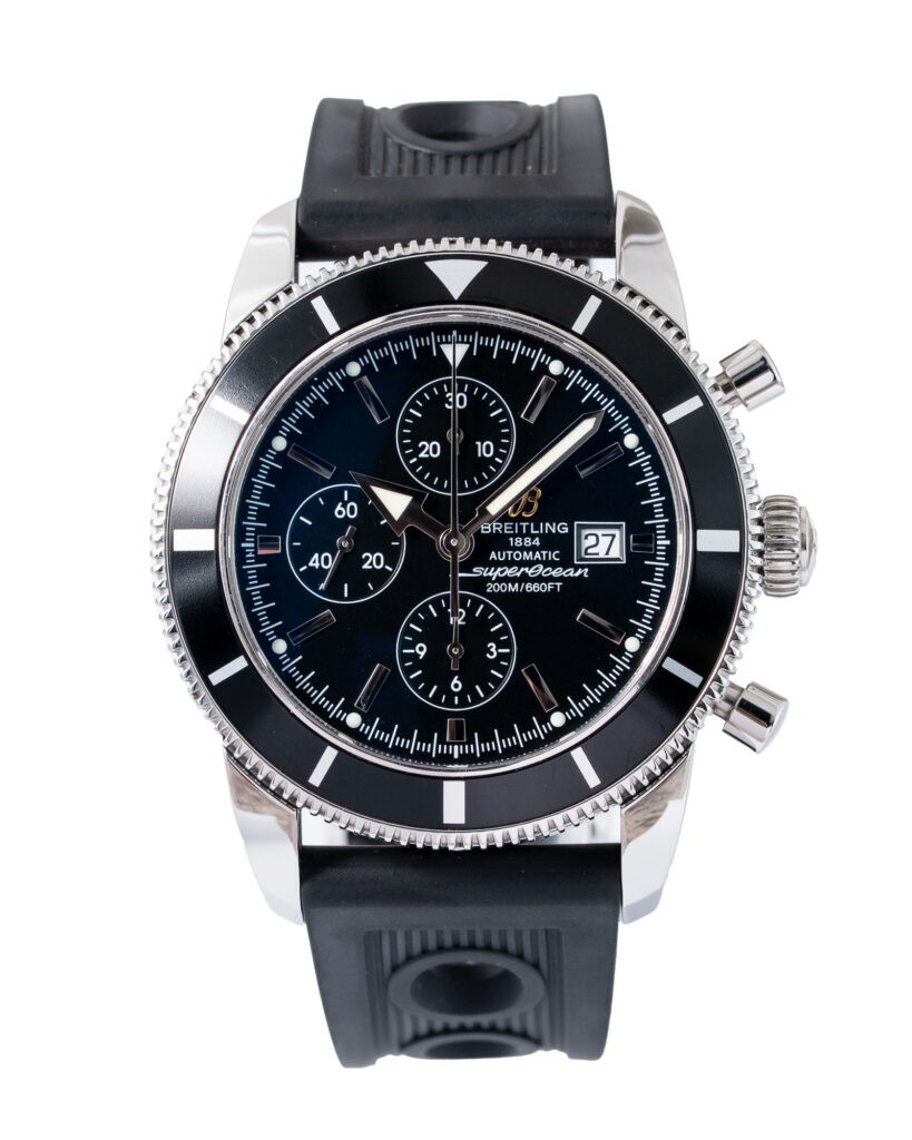 brand: Breitling Reference: A1332024 Model: Superocean Heritage case MATERIAL: Steel strap: Rubber case Size (MM): 46mm Dial colour: Black Bezel: Ceramic Year: 07/2014 Condition: Excellent Box papers : Paperwork/box