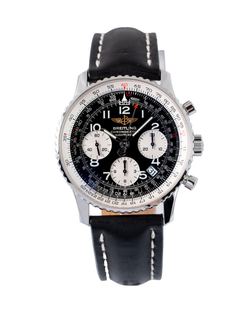 brand: Breitling Reference: A23322 Model: Navitimer case MATERIAL: Steel strap: Leather case Size (MM): 42mm Dial colour: Black Bezel: Steel Condition: Excellent Box papers : Box