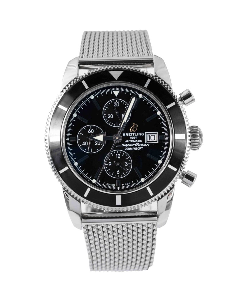 brand: Breitling Reference: A1332024 Model: Superocean Heritage case MATERIAL: Steel strap: Bracelet case Size (MM): 46mm Dial colour: Black Bezel: Ceramic Year: 12/2015 Condition: Excellent Box papers : Paperwork/box