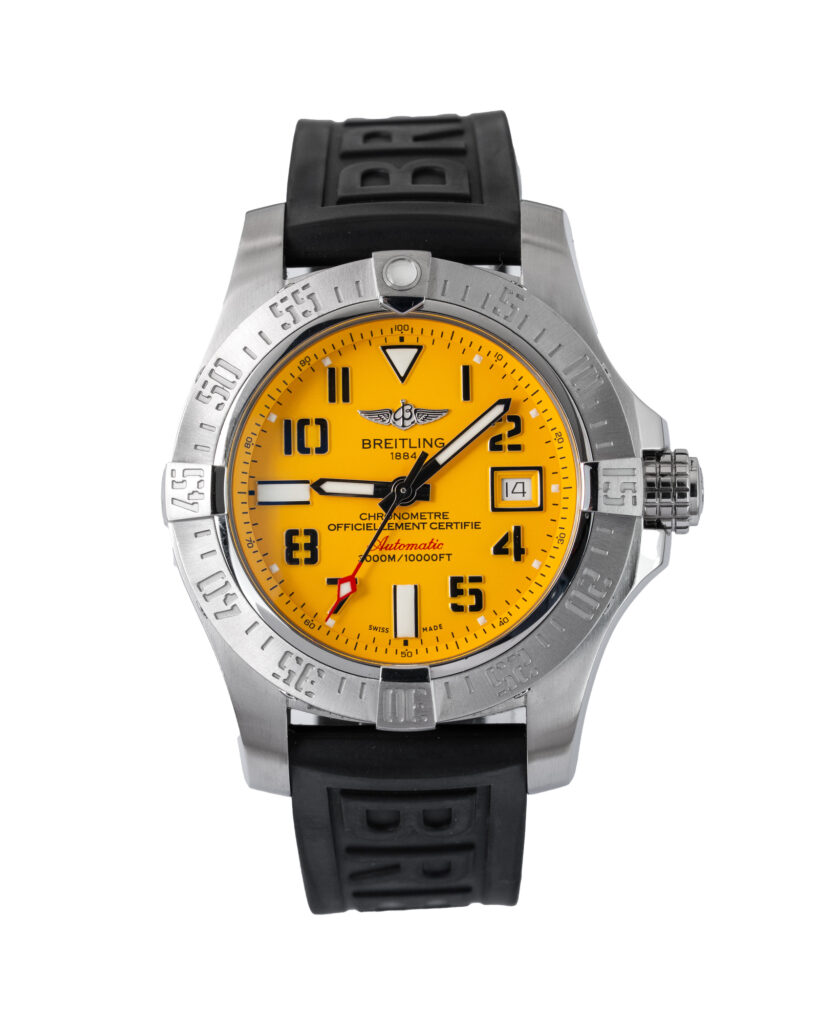 brand: Breitling Reference: A1733110 Model: Avenger II Seawolf case MATERIAL: Steel strap: Rubber case Size (MM): 45mm Dial colour: Yellow Bezel: Steel Year: 04/2016 Condition: Excellent Box papers : Paperwork/box