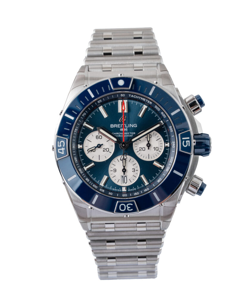 brand: Breitling Reference: AB0136 Model: Super Chronomat case MATERIAL: Steel strap: Bracelet case Size (MM): 44mm Dial colour: Blue Bezel: Ceramic Year: 10/2023 Condition: Unworn Box papers : Paperwork/box