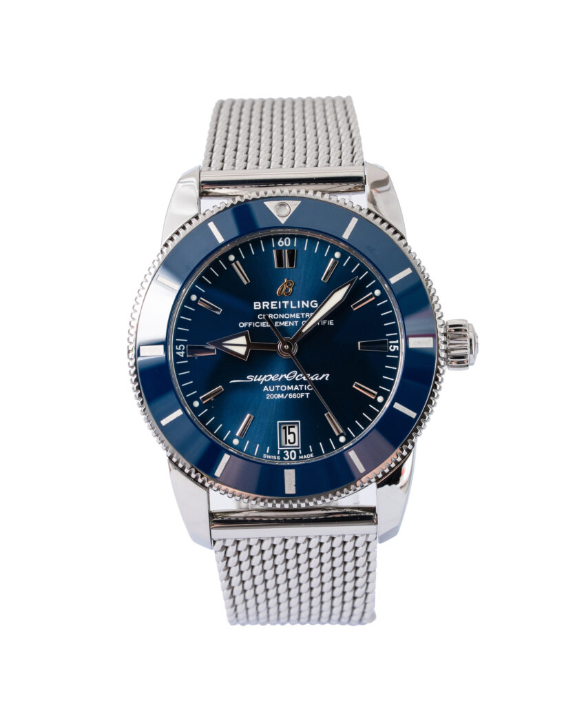brand: Breitling Reference: AB2010 Model: Superocean Heritage II 42 case MATERIAL: Steel strap: Bracelet case Size (MM): 42mm Dial colour: Blue Bezel: Steel Year: 06/2021 Condition: Excellent Box papers : Paperwork/box