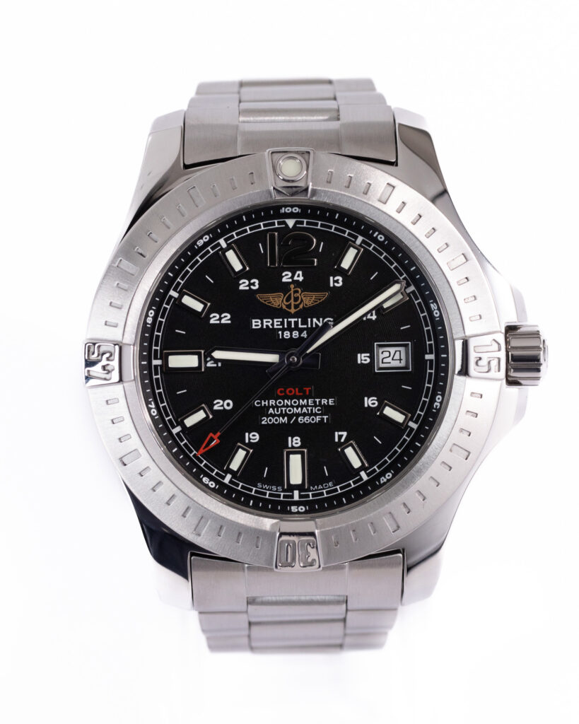 brand: Breitling Reference: A1738811 Model: Colt case MATERIAL: Steel strap: Bracelet case Size (MM): 44mm Dial colour: Black Bezel: Steel Year: 01/2017 Condition: Excellent Box papers : Paperwork/box