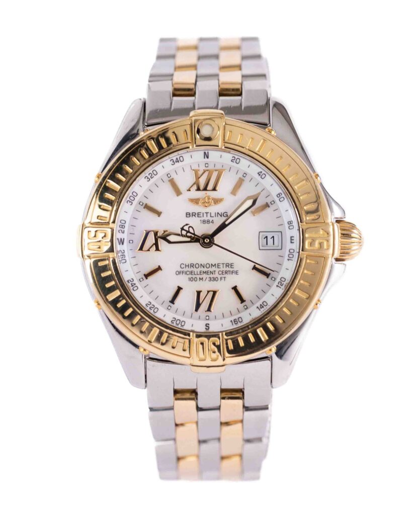 brand: Breitling Reference: D71365 Model: B-Class case MATERIAL: Steel & Yellow Gold strap: Bracelet case Size (MM): 32mm Dial colour: Mother Of Pearl Bezel: Yellow Gold Condition: Good Box papers : Paperwork/box