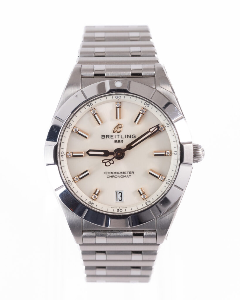 brand: Breitling Reference: A77310 Model: Chronomat 32 case MATERIAL: Steel strap: Bracelet case Size (MM): 32mm Dial colour: Ivory Bezel: Steel Year: 07/2022 Condition: Excellent Box papers : Paperwork/box