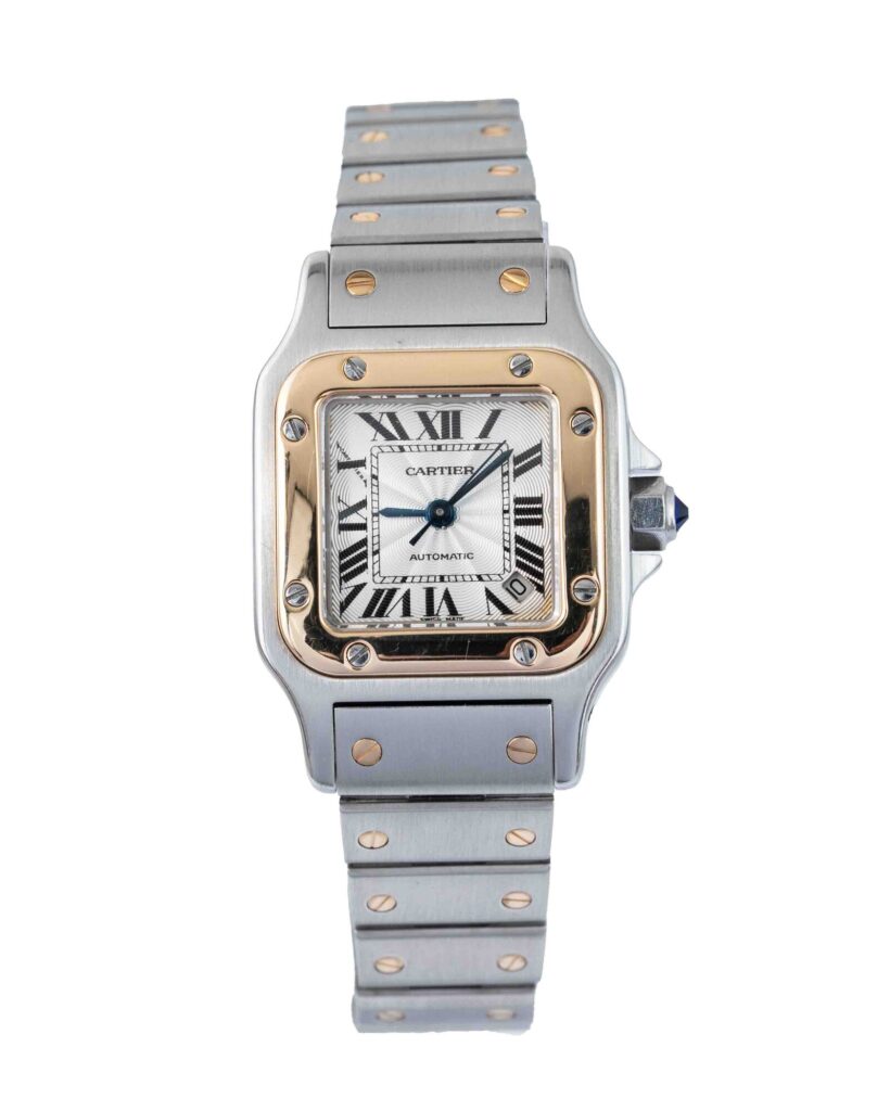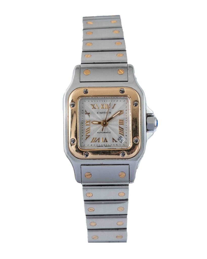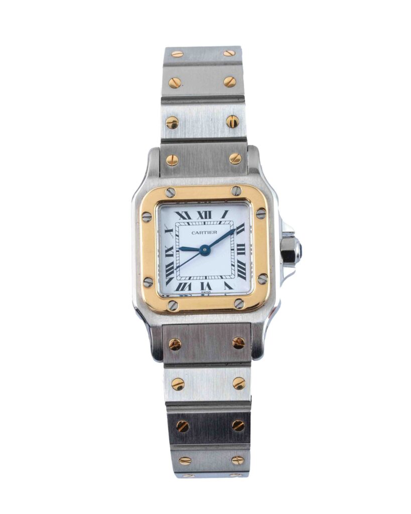 brand: Cartier Reference: 2423 Model: Santos Galbée case MATERIAL: Steel & Yellow Gold strap: Bracelet case Size (MM): 24mm Dial colour: White Bezel: Yellow Gold Condition: Good Box papers : Box