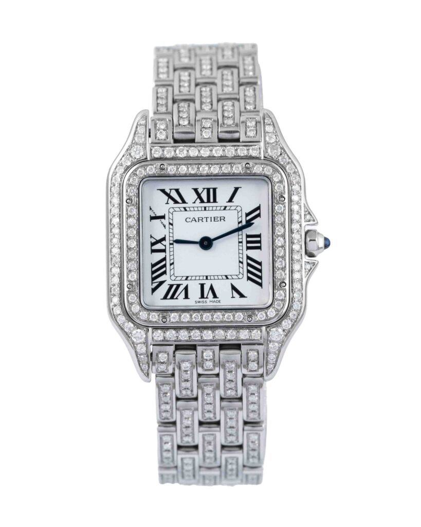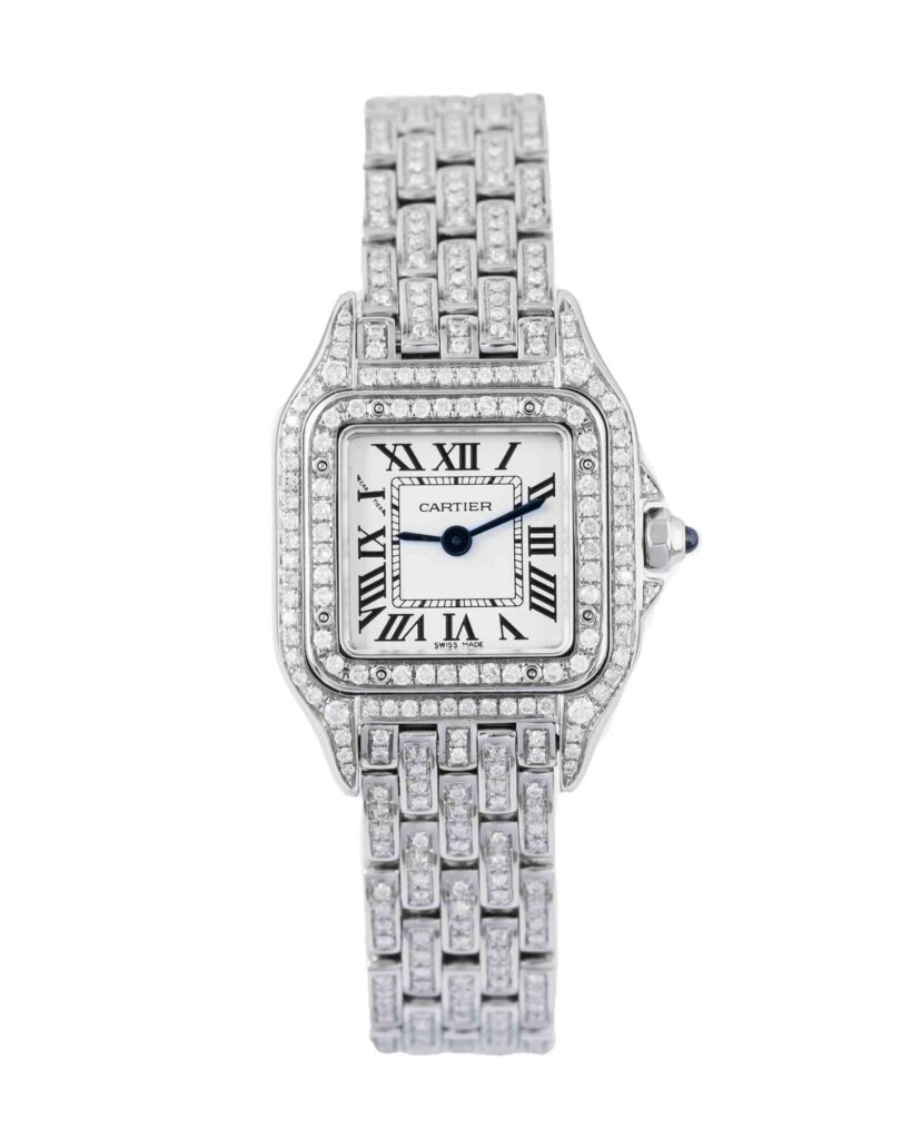 brand: Cartier Reference: WSPN007 Model: Panthere De Cartier case MATERIAL: Steel strap: After Market Diamond Setting case Size (MM): 27mm Dial colour: White Bezel: Steel Year: 09/2020 Condition: Excellent Box papers : Box