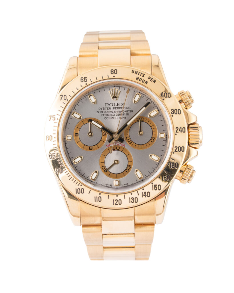 brand: Rolex Reference: 116528 Model: Daytona case MATERIAL: Yellow Gold strap: Bracelet case Size (MM): 40mm Dial colour: Grey Bezel: Yellow Gold Condition: Excellent Box papers : Service Paper/box
