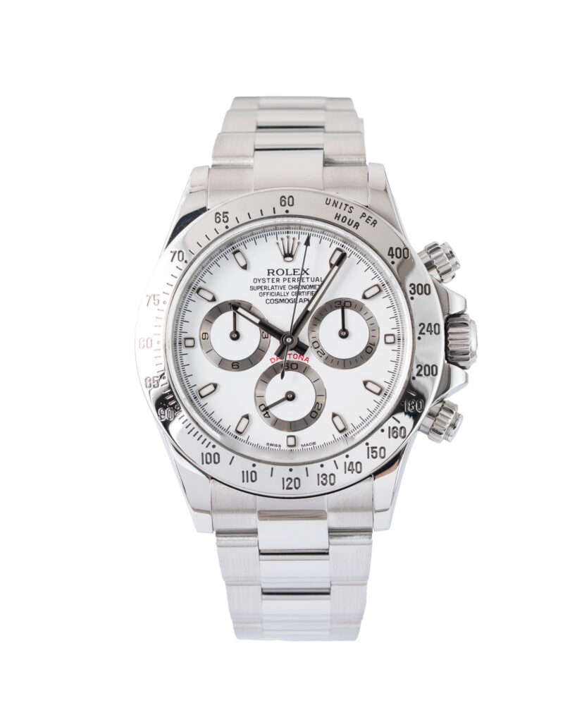 brand: Rolex Reference: 116520 Model: Daytona case MATERIAL: Steel strap: Bracelet case Size (MM): 40mm Dial colour: White Bezel: Steel Year: 08/2014 Condition: Excellent Box papers : Paperwork/box