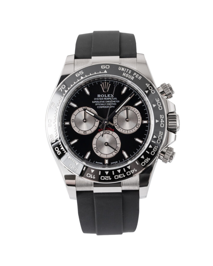 brand: Rolex Reference: 126519LN Model: Daytona case MATERIAL: White Gold strap: Rubber case Size (MM): 40mm Dial colour: Black Bezel: Ceramic Year: 12/2025 Condition: Excellent Box papers : Paperwork/box