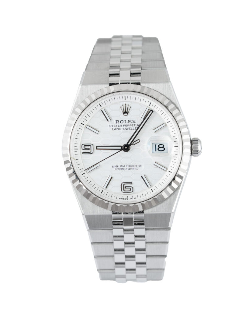 brand: Rolex Reference: 127234 Model: Land-Dweller case MATERIAL: Steel strap: Bracelet case Size (MM): 36mm Dial colour: White Bezel: White Gold Year: 12/2025 Condition: Unworn Box papers : Paperwork/box