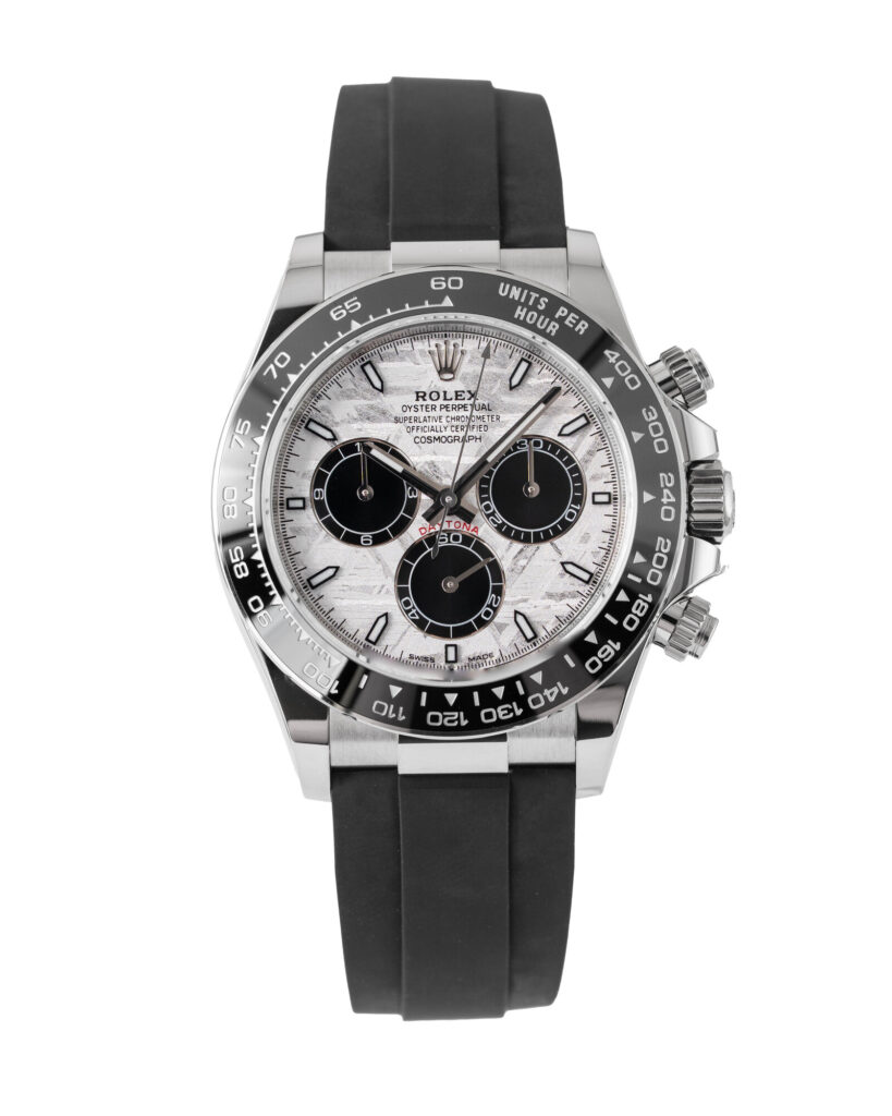 brand: Rolex Reference: 126519LN Model: Daytona case MATERIAL: White Gold strap: Rubber case Size (MM): 40mm Dial colour: Meteorite Bezel: Ceramic Year: 11/2025 Condition: Excellent Box papers : Paperwork/box