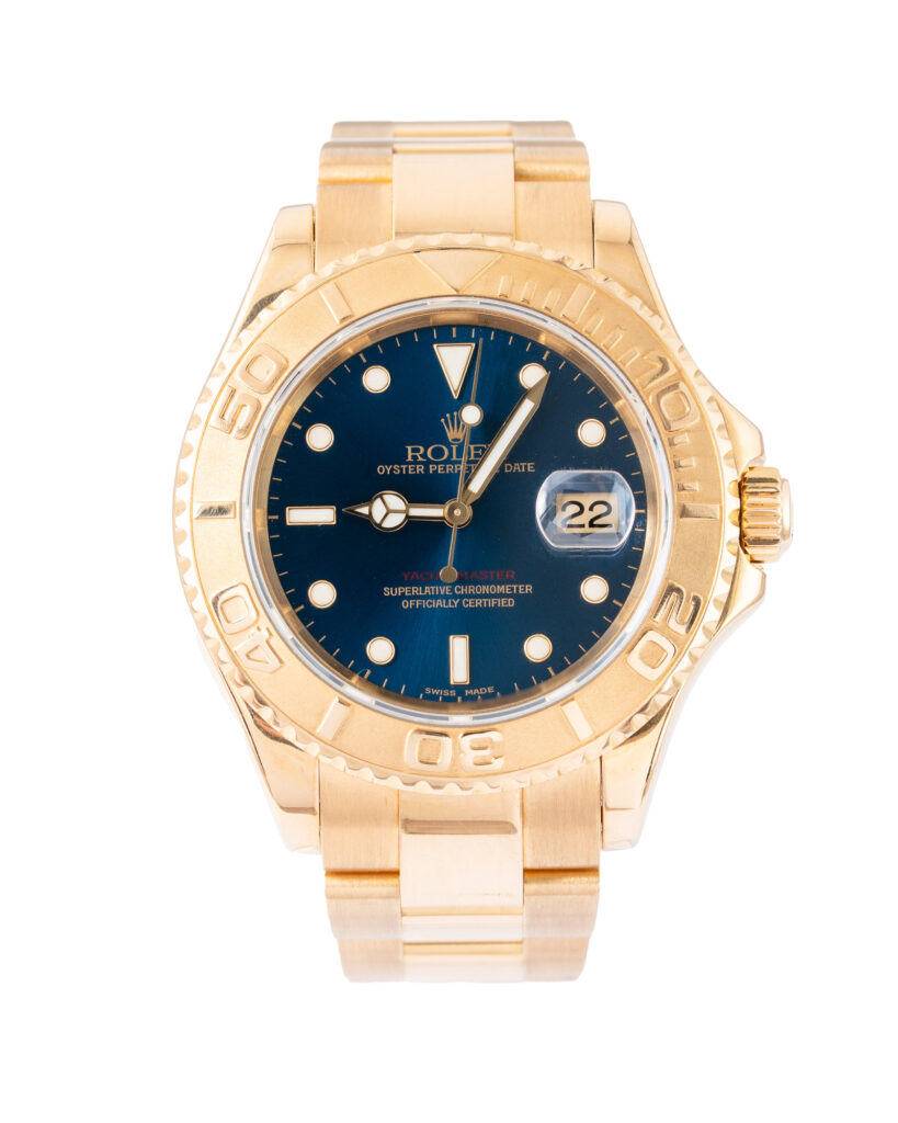 brand: Rolex Reference: 16628 Model: Yacht-Master case MATERIAL: Yellow Gold strap: Bracelet case Size (MM): 40mm Dial colour: Blue Bezel: Yellow Gold Year: 10/2004 Condition: Excellent Box papers : Paperwork/box
