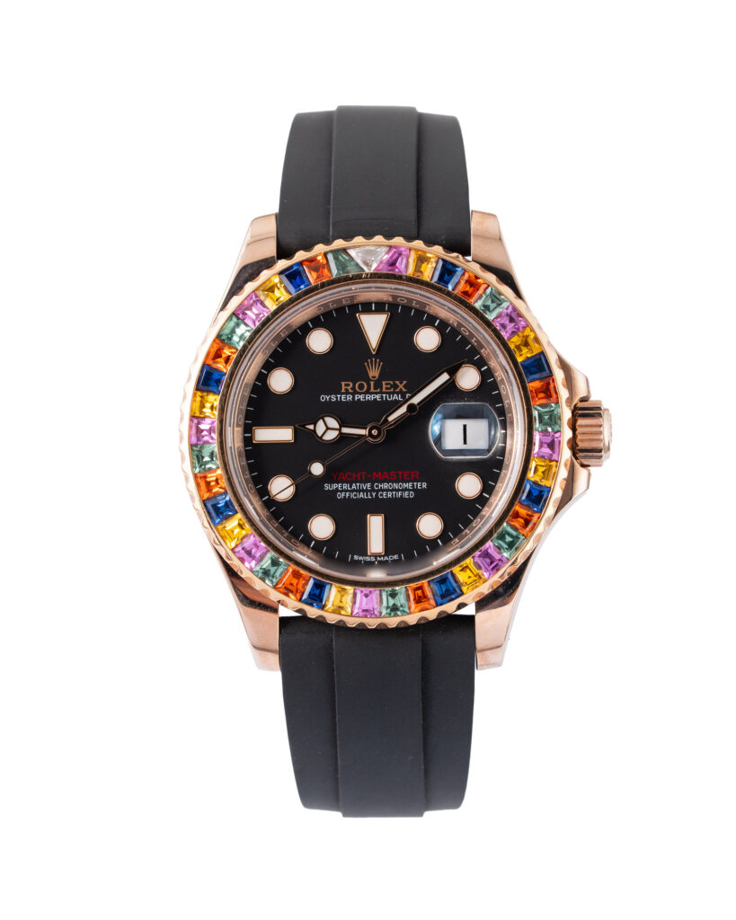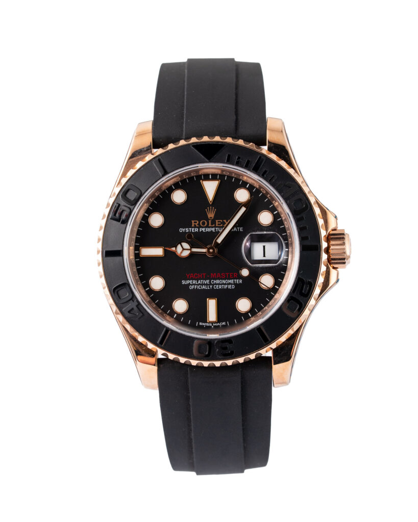 brand: Rolex Reference: 116655 Model: Yacht-Master case MATERIAL: Rose Gold strap: Rubber case Size (MM): 40mm Dial colour: Black Bezel: Ceramic Condition: Excellent Box papers : Paperwork/box