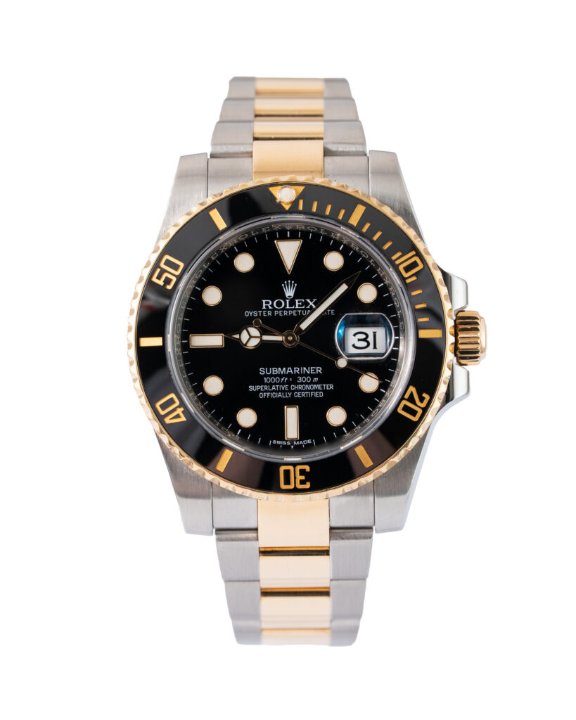brand: Rolex Reference: 116613LN Model: Submariner case MATERIAL: Steel & Yellow Gold strap: Bracelet case Size (MM): 40mm Dial colour: Black Bezel: Ceramic Condition: Excellent Box papers : Paperwork/box
