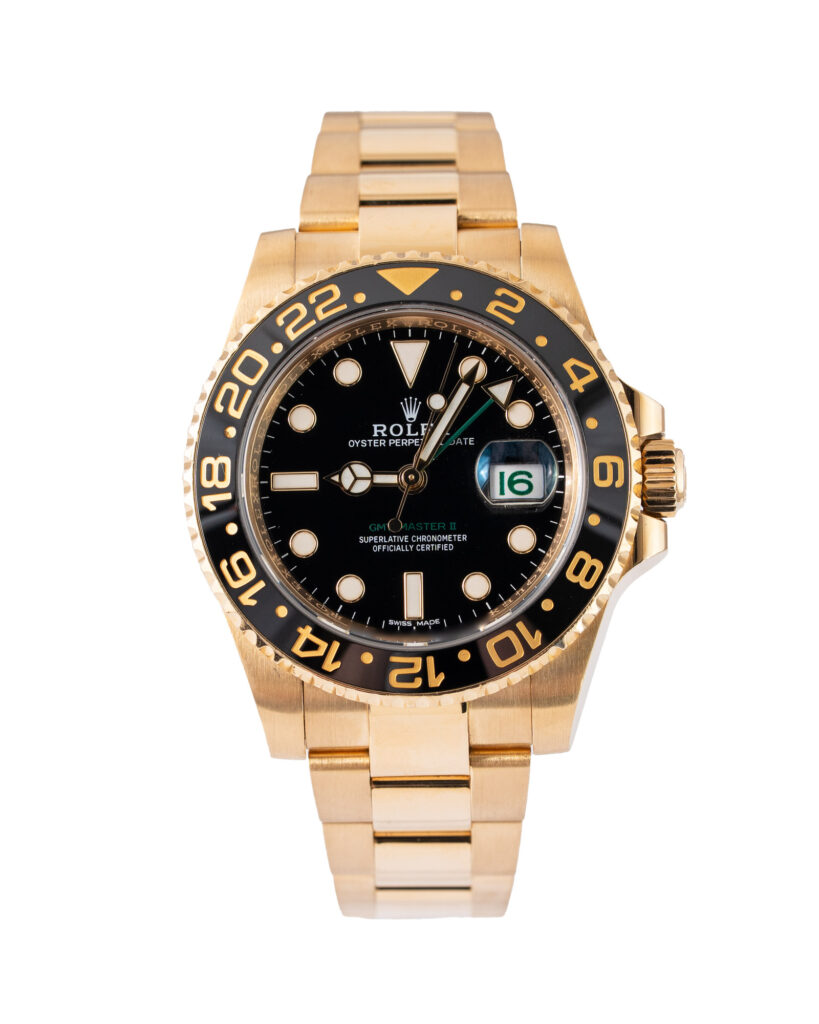 brand: Rolex Reference: 116718LN Model: GMT-Master II case MATERIAL: Yellow Gold strap: Bracelet case Size (MM): 40mm Dial colour: Black Bezel: Ceramic Condition: Excellent Box papers : Paperwork/box