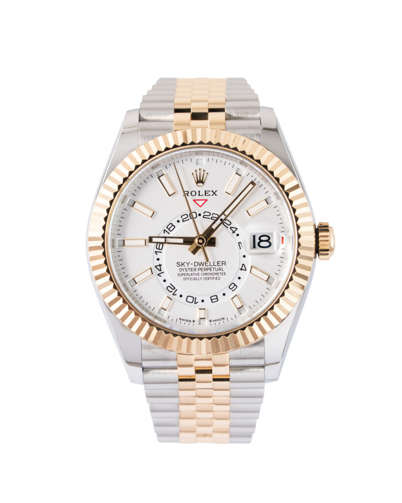 brand: Rolex Reference: 336933 Model: Sky-Dweller case MATERIAL: Steel & Yellow Gold strap: Bracelet case Size (MM): 42mm Dial colour: White Bezel: Yellow Gold Year: 08/2024 Condition: Excellent Box papers : Paperwork/box