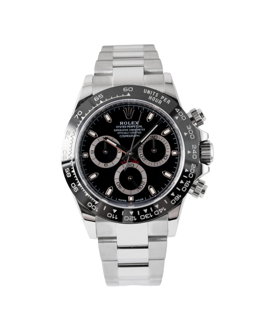 brand: Rolex Reference: 116500LN Model: Daytona case MATERIAL: Steel strap: Bracelet case Size (MM): 40mm Dial colour: Black Bezel: Ceramic Condition: Excellent Box papers : Paperwork/box