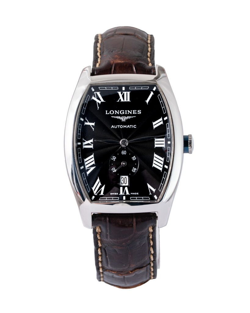 brand: Longines Reference: L2.642.4 Model: Evidenza case MATERIAL: Steel strap: Leather case Size (MM): 33mm Dial colour: Black Bezel: Steel Condition: Excellent Box papers : Box