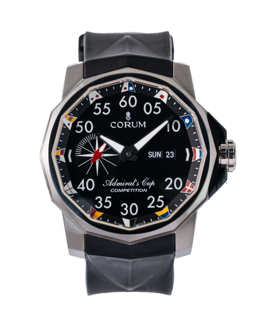 brand: Corum Reference: 947.931.04 Model: Admirals Cup Competition case MATERIAL: Titanium strap: Rubber case Size (MM): 48mm Dial colour: Black Bezel: Titanium Year: 03/2007 Condition: Excellent Box papers : Paperwork/box
