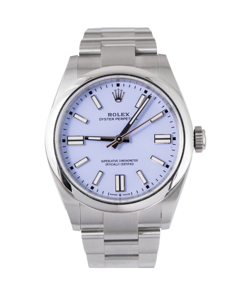 brand: Rolex Reference: 134300 Model: Oyster Perpetual case MATERIAL: Steel strap: Bracelet case Size (MM): 41mm Dial colour: Purple Bezel: Steel Year: 11/2025 Condition: Unworn Box papers : Paperwork/box