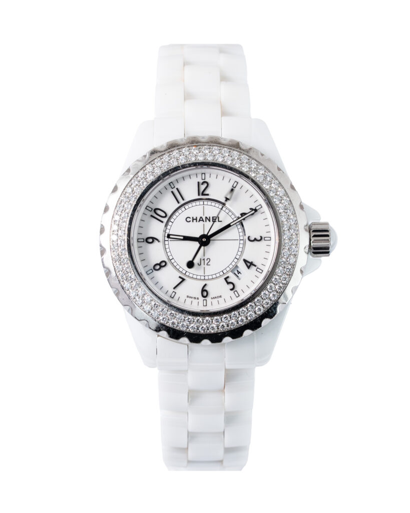 brand: Chanel Reference: H0967 Model: J12 case MATERIAL: Ceramic strap: Ceramic case Size (MM): 33mm Dial colour: White Bezel: Diamond Year: 12/2006 Condition: Excellent Box papers : Box