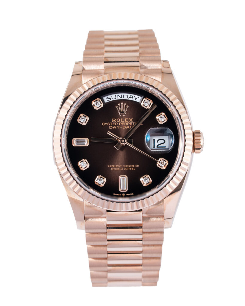 brand: Rolex Reference: 128235 Model: Day-Date case MATERIAL: Rose Gold strap: Bracelet case Size (MM): 36mm Dial colour: Brown Ombre Bezel: Rose Gold Year: 07/2022 Condition: Unworn Box papers : Paperwork/box