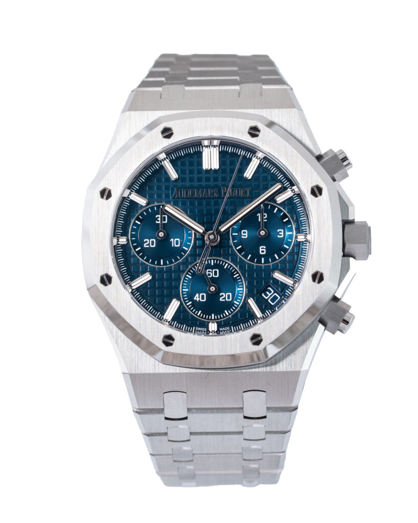 brand: Audemars Piguet Reference: 26240ST.OO.1320ST.05 Model: Royal Oak Chronograph case MATERIAL: Steel strap: Bracelet case Size (MM): 41mm Dial colour: Blue Bezel: Steel Year: 09/2025 Condition: Unworn Box papers : Paperwork/box