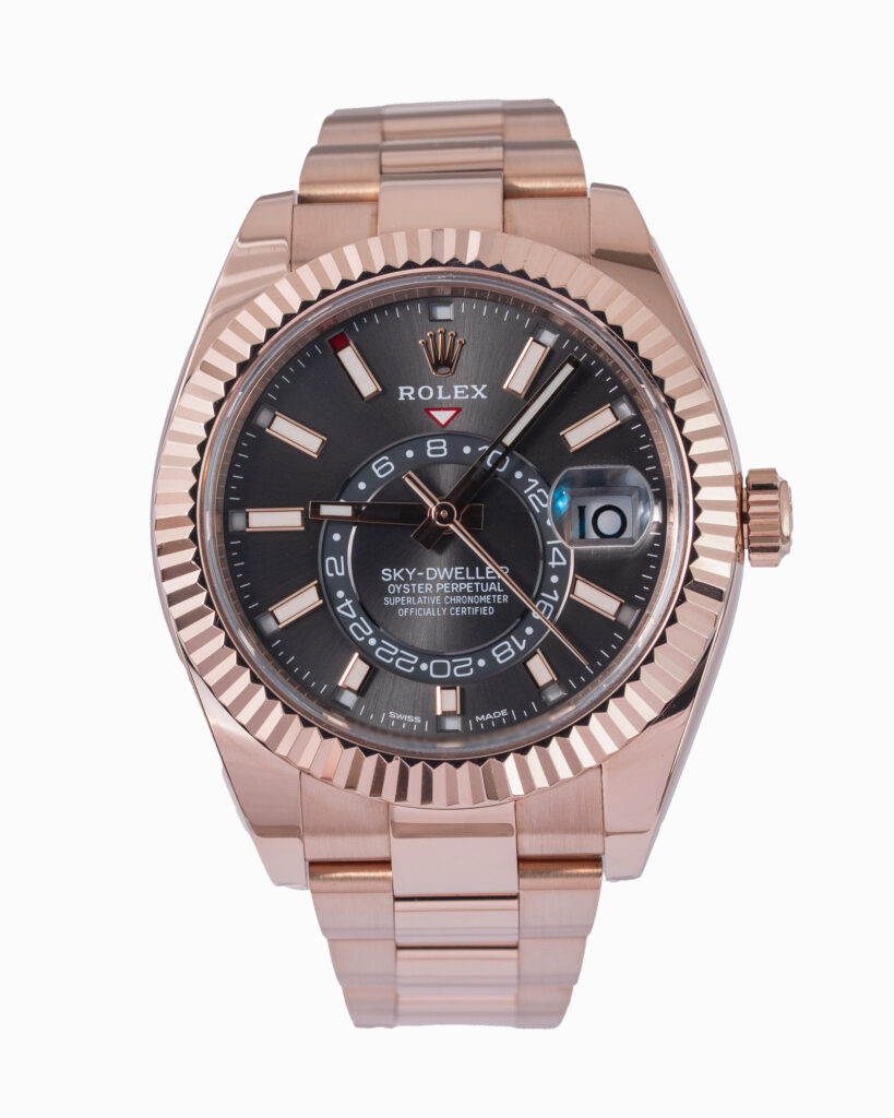 brand: Rolex Reference: 326935 Model: Sky-Dweller case MATERIAL: Rose Gold strap: Bracelet case Size (MM): 42mm Dial colour: Grey Bezel: Rose Gold Year: 08/2018 Condition: Excellent Box papers : Paperwork/box